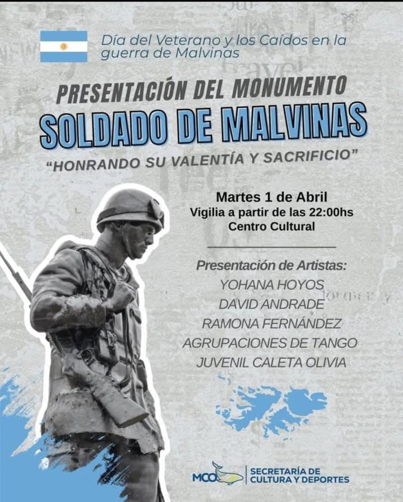 En el marco de una nueva vigilia aguardando la llegada del 2 de Abril, se realizará la presentación del monumento en inmediaciones del Centro Cultural. El director de patrimonio, el escultor Alberto Rojas realizó esta obra en homenaje a los ex combatientes y caídos en la guerra.
