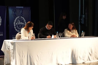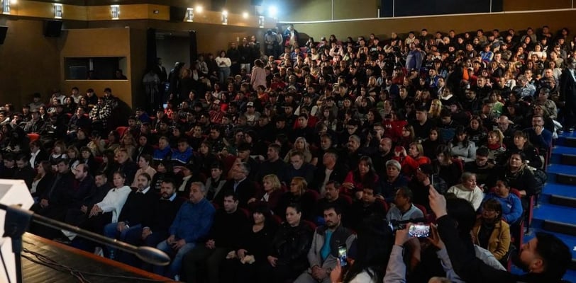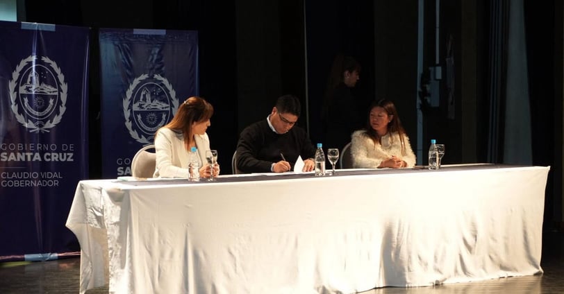 El Centro Cultural Municipal de Caleta Olivia se colmó de jóvenes, este jueves 3 de abril, para ser espectadores de la firma del acta acuerdo entre el Gobierno de Santa Cruz, el Consejo Provincial de Educación y la Cámara Minera de Santa Cruz (CAMICRUZ). El gobernador Claudio Vidal encabezó el acto que contó con el acompañamiento del sector sindical, empresas del ámbito minero, funcionarios del gabinete municipal e intendentes de otras localidades.