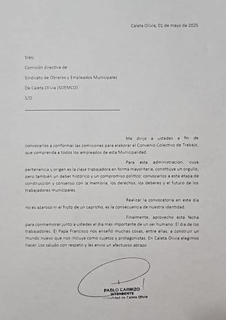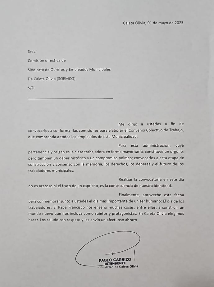 En la carta enviada a los representantes gremiales de los trabajadores municipales, firmada de puño y letra por el propio Pablo Carrizo, se afirma que “para esta administración, cuya pertenencia y origen es la clase trabajadora en forma mayoritaria, constituye un orgullo, pero también un deber histórico” realizar la mencionada convocatoria.
