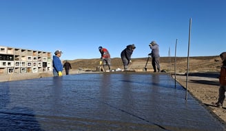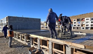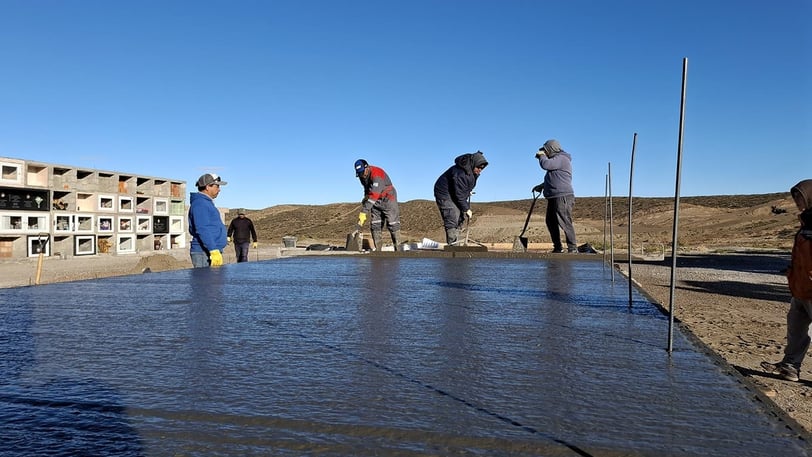 En este marco, detalló que durante la mañana de este jueves 13 de marzo, se avanzó con el llenado de dos losas, una de seis metros por tres metros, utilizando cuatro metros cúbicos de hormigón y también una losa extra grande que requirió 3,5 metros cúbicos de hormigón para cinco nichos.